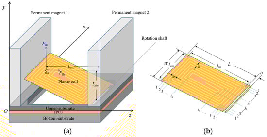 where n is the number of turns of the plane coil; id, jl, and jr denote the numbers of wires in the plane coil along different directions as shown in Figure 7b, and Mid, Mjl, and Mjr are the corresponding torques of electromagnetic force on the wires, respectively.