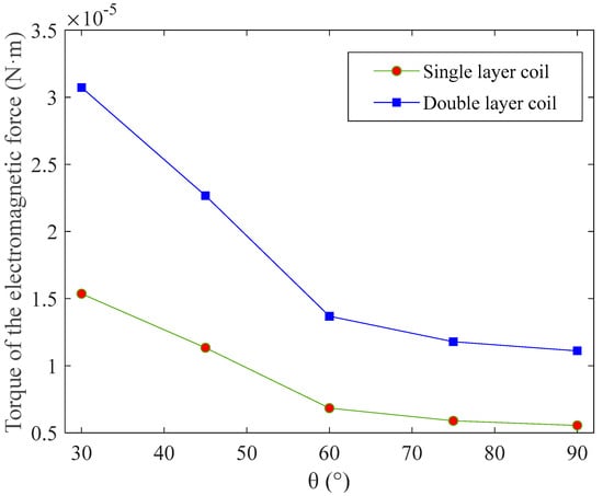 Assuming that the structural and material parameters of permanent magnets 1 and 2 are identical, their length, height, thickness, and surface current density values are 4 mm, 3 mm, 1 mm, and 1 × 10−6 A/m [], respectively. The thickness of the upper- substrate is 1 mm. The longest wire length values along the coil’s length and width directions are 3.3 mm and 2.8 mm, respectively. The linewidth of the coil wire is 0.1 mm, the adjacent wire distance is 0.15 mm, the number of turns of a single-layer coil is seven, and the current in the coil is 1 A. Using Equations (1)–(17), the total torque of the electromagnetic force on single- and double-layer coils are calculated for the angles between the coil plane and the xOz plane of 30°, 45°, 60°, 75°, and 90°, as shown in Figure 8.