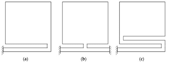 The resistance torque of a torsion beam is closely related to the structural parameters and size of the torsion beam, which has a strong influence on the deflection of a coil element. Microshutter elements with three typical torsion beam structures are presented in Figure 9. Figure 9a shows the torsion beam structure supported by a single beam; Figure 9b presents the torsion beam structure supported by two beams connected in parallel; Figure 9c displays the torsion beam structure supported by two beams connected in series.