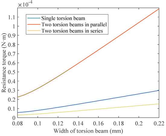 As the length of a single beam presented in Figure 9a is 3.2 mm, when two beams are connected in parallel (the structure in Figure 9b) the length of each beam is 1.6 mm; but when two beams are connected in series, the structure in Figure 9c, the length of the second beam is slightly shorter than that of the first beam. In this study, the length of the second beam is set to 3.1 mm. Considering that the material of a FPCB is mainly polyimide with Young’s modulus of 3.1 GPa and Poisson’s ratio of 0.34, then according to Equations (18)–(23) and the aforementioned torsion beam parameters, the resistance torque for the three structures with different beam widths when the planar coil element is deflected to 90° can be calculated, as shown in Figure 10.