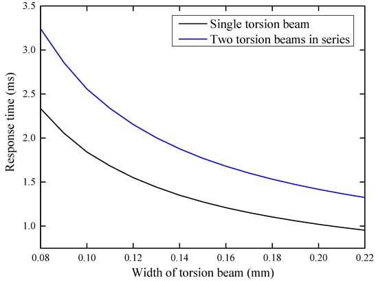 Considering that the material of the torsion beam is mainly polyimide with material density of 1.4 kg/m3 and the thickness of the planar coil element is 0.1 mm, using Equations (24) and (25), the response times of the single torsion beam and the beam structure with two torsion beams connected in series at different beam widths are calculated, as shown in Figure 11.