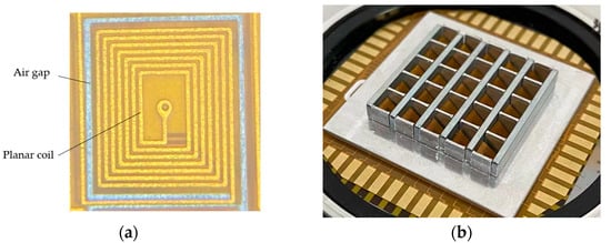 (a) The microscopic picture of a fabricated planar coil element. (b) Fabricated microshutter array sample based on the electromagnetic actuation.