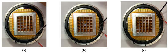 A digital multimeter (UNI-T UT603, Uni-Trend technology Co., Ltd., Dongguan, China) was used to measure the resistance of a planar coil element. The measured resistance of the coil element was approximately 3 Ω. A voltage of 3 V was applied to the coil element by a DC power source (Keysight E3632A, Keysight Technologies, Santa Rosa, CA, USA), and the current in the coil was roughly 1 A. We found that the coil element could be completely opened, as shown in Figure 13a. After the voltage was removed, the microshutter element returned to the closed state under the influence of the restoring force of the torsion beam. When a 3-V voltage was applied to the other coil element, the corresponding microshutter element was also turned on, as shown in Figure 13b,c. The experimental results were consistent with the theoretical analysis results.