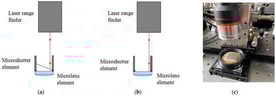 Schematic diagram and experimental setup of the response time measurement of a microshutter element by a laser range finder. (a) shows the laser was incident on the surface of the microshutter element before applying voltage to the planar coil element; (b) shows was the laser incident on the back surface of the microlens element after applying voltage to the planar coil element. (c) shows the experimental setup for measuring the response time of a microshutter element.
