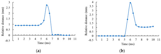 In the experiment, the back surface of the microlens element was taken as the zero-displacement plane, and the relative displacement of the laser spot on the microshutter element’s surface relative to the zero-displacement plane was defined as positive displacement when the position of the laser spot on the microshutter element’s surface was higher than the zero-displacement plane. Figure 15 shows the variation of the relative displacement with time. It can be seen from Figure 15a that the relative displacement increased first and then decreased rapidly in the process of switching from state (a) to state (b) in Figure 14 after the voltage was applied. This was because the distance between the laser spot on the microshutter element’s surface with the zero-displacement plane gradually increased during the deflection of the microshutter element. However, when the deflection angle of the microshutter element was close to 90°, the laser left the microshutter element and was visible on the back surface of the microlens element. Therefore, the relative displacement rapidly changed to about 0. The time difference from the beginning of deflection of the microshutter element to the laser incident on the back surface of the microlens element was the opening time of the microshutter element. It can be seen from the Figure 15a that the opening time of the microshutter element was approximately 2.5 ms. Similarly, the closing time required to recover from state (b) to state (a) in Figure 14, after the voltage was removed, was also roughly 2.5 ms, as shown in Figure 15b. The test results were basically consistent with the theoretical analysis results, which proved the feasibility of using a microshutter array based on the electromagnetic actuation in a FOV gated imaging system.