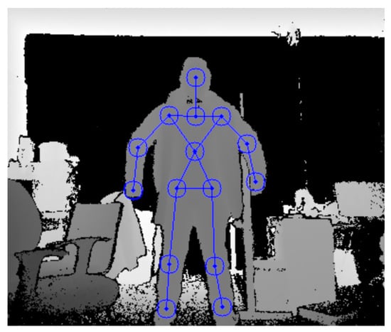 To retrieve motion body data of the operator, the Microsoft Kinect V2 [31] was used. It combines a camera and a depth sensor to capture depth, color, and IR images to retrieve 3D object data. Both the color and depth image are transformed into a common frame, with the origin located at the center of the sensor, called Camera Space [32]. These devices are commonly used for body tracking and are more affordable compared to full body tracking suites. Nonetheless, this kind of sensor has two disadvantages. First, data acquisition is noisy and has to be treated before it is used in tasks with precision requirements. Second, by relying on the sensor’s field of vision, the data acquired depends on the tracking of the body that is not occluded by other objects or even by other parts of the body. By working in a Linux environment, there is often official support with drivers of devices such as the Kinect sensor or the Meta Quest, which usually worked with just Windows platforms or their game console device. To work with the Kinect, finding a third-party driver is necessary that can retrieve depth images and allow human body recognition with this sensor. OpenNI2 (Open Natural Interaction) is an open-source software development kit for the RGB-D sensor as the Kinect sensor or the PrimeSense camera [33]. In addition, NiTE2 is a middleware, which has features such as human detection, posture estimation, hand tracking, and gesture detection. For this project, it is used to achieve the Cartesian coordinates of 15 identifiable joints [34]. Furthermore, it was used with the python bindings because it is easier to program in the ROS environment, which was coded in python in its majority. An example of human body tracking is shown in Figure 4.
