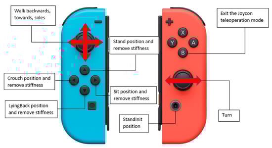 The first mode of teleoperation aims to move the robot from one distance to another in the easiest way possible for the operator. In this mode, the user only has to manipulate the Nintendo Switch controllers [37] to move the robot forward, backward, to the sides, and even turn. Some buttons are also included to make the robot perform certain pre-programmed poses, such as sitting, lying down, or standing to be ready for a walking movement. This disposition can be seen in Figure 6. The movement begins by pressing the “START” button, which puts the robot in the initial position (“StandInit”) and enables the stiffness of the robot’s joints to control its mobility. Then the robot is ready to be moved by the thumbsticks in any direction. When button “B” is pressed, the operator exits this teleoperation and goes to the application’s main menu. This mode is also compatible with the Meta Quest use; the operator can move the robot’s head and receive the image of its camera without interfering with the NAO walking process.