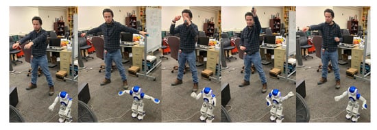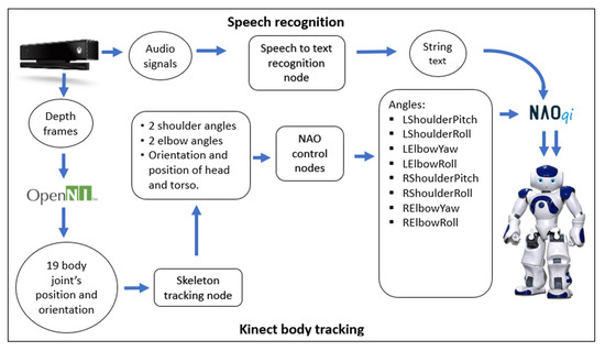 - Avalos, J.; Cortez, S.; Vasquez, K.; Murray, V.; Ramos, O.E. Telepresence using the kinect sensor and the NAO robot. In Proceedings of the 2016 IEEE 7th Latin American Symposium on Circuits Systems (LASCAS), Florianopolis, Brazil, 28 February–2 March 2016; pp. 303–306. [Google Scholar] [CrossRef]