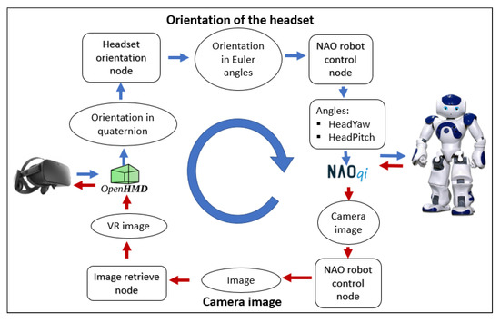 The control structure of the software implementation and its architecture is depicted in Figure 5. The blue lines represent data provided by the operator to control the robot’s motion. In contrast, the red lines represent the data provided by the NAO to have a visual confirmation of the robot movements from a first-person perspective. As observed, the three devices had independent communication with the robot, allowing it to divide the teleoperation process in parallel actions that control each of them as part of the robot.