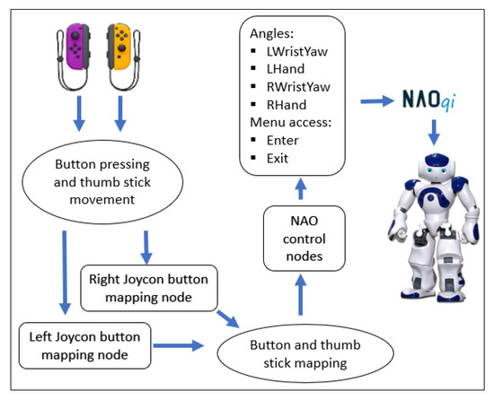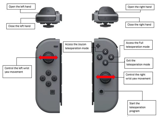 Finally, the Nintendo Switch Joycons are used to control the wrist and hand joints by pressing certain buttons, as well as being able to enter and exit this teleoperation method. These controllers are implemented because the library used for tracking the human body does not recognize the movement of supination and pronation of the forearm and the fingers movements. Thus, to move the robots’ wrist joints, Joycon thumbsticks are used, and to open and close the hands, two buttons from each controller are used to perform each action. The arrangement of the buttons and thumbsticks in the controller for this modality is shown in Figure 9. The treatment process of the information received using the Joycons to control the robot is shown in Figure 10.