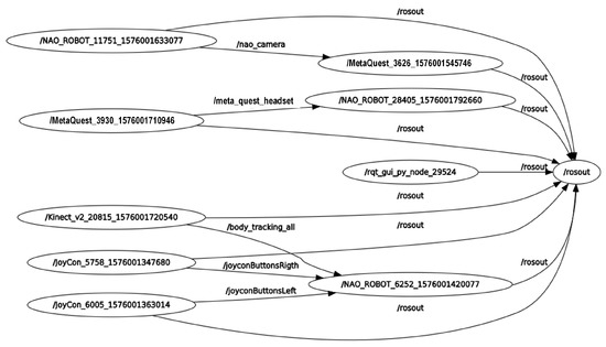 A publisher/subscriber communication is used so that a parallel programming architecture can handle the sensing devices and the NAO robot, managing several nodes to control them. This kind of programming improves the data transmission and allows independence in non-sequential procedures that govern the robot’s movements or functionality. Furthermore, message formats with predefined types of variables are used for universal purposes within the project. So, sent data can be read and used regardless of the programming language in which a node was developed. An ROS rqt_graph, including the nodes and topics, is shown in Figure 11.