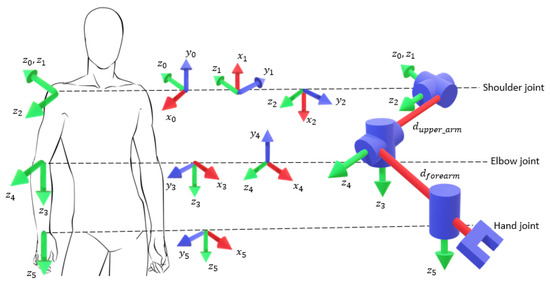 With these concepts clear, an analytical approach to the reverse kinematics of each robot arm can be made, as explained in the work of Kofinas, Orfanoudakis, and Lagoudakis [38]. The representation of each of the arm manipulators of the robot can be represented as the plot of five joints according to the Modified Denavit–Hartenberg Parameter shown in Table 1 and Figure 13.