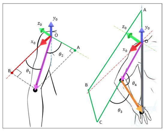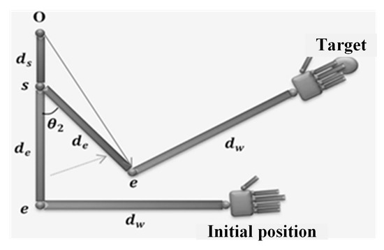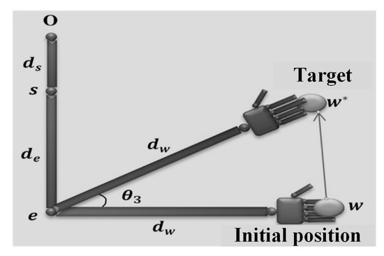 The distance (R) and angle () situated between and the virtual axis that links the end-effector position and the shoulder position permit us to determine the elbow position. From this position, it is easy to determine , , analytically. From the known rotation of the end-effector and angles (, , , and ), the joint can be defined easily by the comparison, as given in Section 4.4.3.