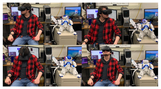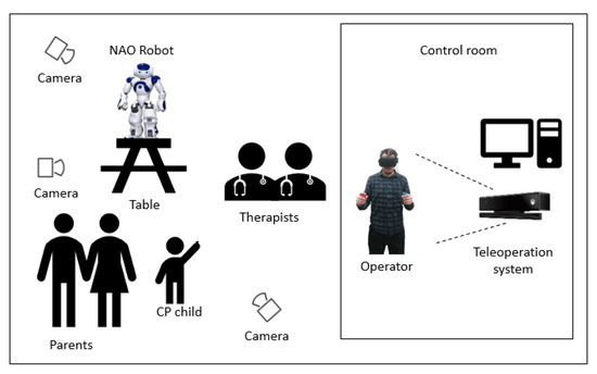 The proposed approach was validated using the Kinect V2 sensor, Meta Quest headset, Nintendo Switch Joycons, and the NAO robot. There is ease between changing the operating modes of the robot, using only the controls, which allows the robot to move in different points easily. More importantly, it allows the follow-up of the arm movements as the operator’s head easily, allowing him to have an immersive experience when controlling the robot, seeing it from the robot’s point of view and speaking through it. Sources of latency were considered originating from the hardware and physical limitations of communication. While transferring videos and motion data we experienced negligible latency (<100 ms). It is clear to think that there are different applications for this telepresence, such as long-distance teaching with active users’ active participation. Moreover, taking into account the work of it, it is possible to say that there is potential to carry out interaction therapies with autistic children [44,45,46,47,48], improving the communication skills of the patients. Therefore, based on the work of Malik, Yussof, and Hanapiah in [49] and Shamsuddin et al. in [50], a therapy work could be proposed with the following experimental layout to analyze the advantages of the teleoperation system to be used for therapeutic purposes, as shown in Figure 26.