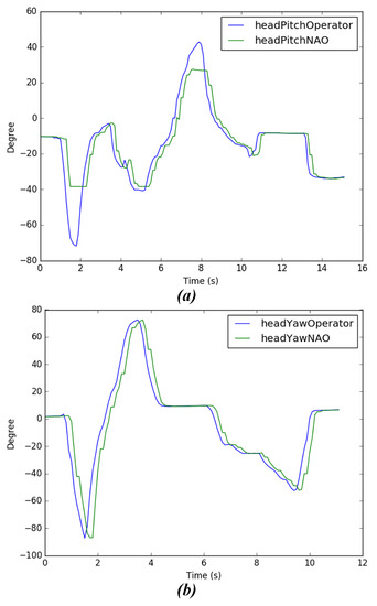 In this part, we experiment to test the stability of the head following system, in which a person puts the Meta Quest headset on and moves their head to move the NAO’s head. First, the operator will rotate their head 80° to the left direction; then they will rotate 80° to the right direction, pitching up with 40° and pitching down with 70°, respectively. Figure 20 shows the process of the experiment. Figure 21a,b graphs were created, wherein data has been retrieved from head movement angles from the operator and the robot. From the result of the head following experiment, the movement of the user’s head can be followed accurately, allowing the operator to have a first-person view from the camera of the robot. However, it can be seen, especially in Figure 21a that the joints of the robot do not reach angles that the operator does due to design restrictions. However, it can be observed that the joints of the robot in both the yaw and pitch movements do not reach angles that the operator achieves, as per design restrictions [41,42]. Nevertheless, if the operator’s head movement exceeds the limits of movement of the robot’s joints, it will move to the closest angle it can.