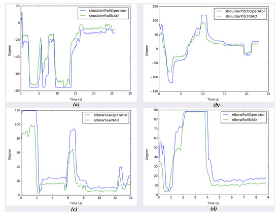 In the second experiment, the operator moves his upper limbs to the Kinect camera to retrieve his movements. Again, the operator carried out different positions shown in Figure 22 to evaluate how precise and accurate the robot’s movements are. The operator is asked to make arm movements that only move one of the joints that define the degrees of freedom of the robot arms to collect the information read by the Kinect in comparison to that read by the sensors of the robot. These joints are ShoulderRoll, ShoulderPitch, ELbowYaw, and ELbowRoll. As a result, a series of graphs can be seen in Figure 23, such as the mapping of the human body, when the arms are facing the chest, which causes the sensor to make mistakes when interpreting the movement joints of the operator, making the robot’s movement not precise. In addition, the fact that for effective body tracking, the operator must be as the front of the sensor as possible, because if he rotates, the interpretation of the movement of the arms becomes inaccurate, by mapping the operator’s torso incorrectly and at the same time the position of the furthest arm from the camera. However, when the operator stays in front of the sensor, the robot follows the operator’s movement in the four joints that are mapped with this sensor continuously.
