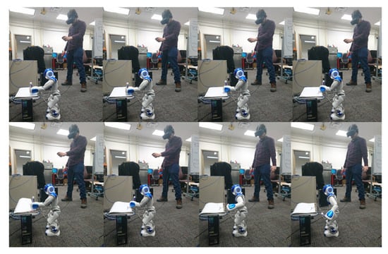 In the following experiment, the entire Kinect, Meta Quest, and Joycons are used. We want to evaluate the use of the three devices simultaneously to control the robot’s movement to see if there is any communication problem when the three devices are in action. In addition, the change in teleoperation modality is also evaluated through the controls to see the independence of the operator in the process, as can be seen in Figure 24.