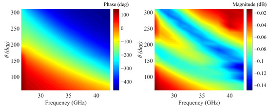 Figure 1 illustrates the overall structure of the designed metasurface. The reflective metasurface is illuminated by a y-polarized wave and expected to transform a spherical wave into an OAM wave. Figure 2a shows the meta-atom structure, where the Taconic TLX-8 (εr = 2.55 and tanδ = 0.0019) is selected as the substrate and the metal patch is 0.017 mm thick copper. The parameters are given as follows: r2 = 0.44mm, g = 0.21, h = 1.14 mm, w = 0.1 mm, P = 4 mm [35]. The structure variation processes of meta-atoms with different θ are depicted in Figure 2b. Obviously, the dimension and orientation of the windmill ring patch vary simultaneously as the θ varies. Dual resonance can be generated to expand the phase range when the circular ring patch and the windmill ring patch reach the resonance size. This means that the proposed meta-atom is a hybrid phase-turning structure which uses both resonant and geometric phase modulation. Figure 3a reveals that the variation of the phase deflection is small within the entire range of 26.5 GHz to 40 GHz. Figure 3b depicts that the proposed meta-atom features low loss, which implies the proposed meta-atom exhibits broadband potential.