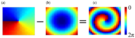 where l is defined as the mode of OAM (i.e., l = 0, ±, ±2…), φ represents the azimuthal angle around the center of the metasurface. k is a wavenumber in free space. dmn represents the distance from the mnth meta-atom to the phase center of the feed. is defined as the meta-atom vector of the reflected beam. The position vector of the mnth meta-atom is defined as . The phase distribution of each meta-atom can be obtained through Equation (1), which is shown in Figure 4.