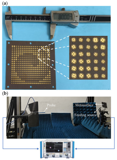 (a) The photograph of the fabricated metasurface; (b) near-field experimental system.