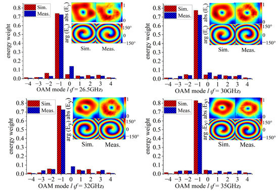 The OAM spectrum of Figure 6 shows that the energy weight of OAM mode l = −1 has occupied the most part of all modes at 35 GHz, and the simulated and measured mode purities are 83% and 80%, respectively. More importantly, the simulated and measured results indicate that the purity of the OAM dominant mode is greater than 70% across 26.5 GHz to 40 GHz, while the OAM mode purity bandwidth is about 38.57%. Measured values are lower than simulation results due to possible environmental noise and fabrication tolerances. However, high mode purity can be maintained in a wide frequency band as the mode l = −1, which corroborates the effectiveness of the proposed generator for widening the bandwidth of OAM mode purity.