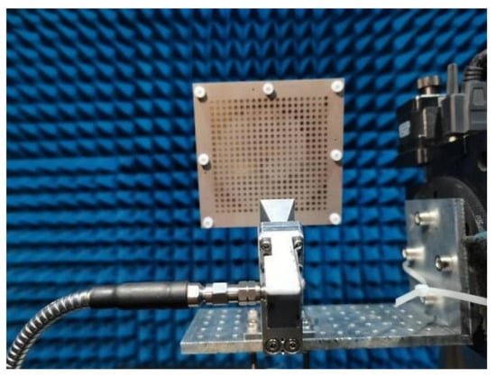 To verify the performance of the generated vortex beam, a square metasurface composed of 400 meta-atoms is fabricated by using PCB technology, as shown in Figure 5a. Furthermore, detailed measurements are employed to evaluate the performance of the generated vortex beam. The work of the generator near-field measurement is carried out on the optical platform to sample the spatial field distribution, as shown in Figure 5b. The standard rectangular waveguide BJ320 (Beijing Xibao Electronic Technology Co., Ltd., Beijing, China) is chosen as the near-field receiving probe. The near-field receiving probe is 1150 mm from the metasurface. The observation plane size is 400mm × 400mm. The test frequency range is from 26.5 GHz to 40 GHz. The calculated results of the amplitude and phase distribution are extracted from the observation plane, as shown in Figure 6. It can be observed that typical annular amplitude distributions can be achieved across the test band. Furthermore, obvious anticlockwise helical phase distributions are observed, which indicates that the reflected beam is a vortex beam with the mode l = −1.