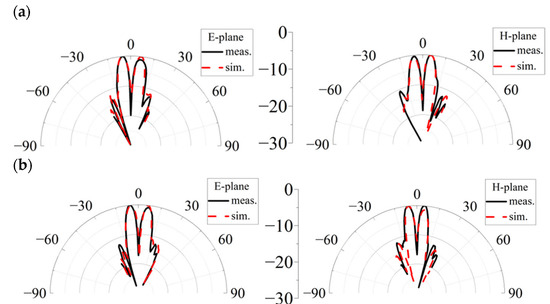 To obtain the far-field radiation performance of the proposed generator, the far-field testing was performed in the anechoic chamber, which is shown in Figure 7. The generator is fixed on the metal rotating pedestal, and the rotating angle is set from −30° to +30°. The transmitting horn is 3 m from the metasurface. The received signal is transmitted into the spectrum analyzer to obtain the radiation patterns of the vortex beam. Figure 8 depicts the normalized radiation patterns of the generated vortex beam. It can be seen that the measured radiation patterns present a typical OAM beam with a peak appearance angle of about ±5°, and good directivity can be maintained in the wide band range. The results of the measurement and simulation in the main lobe region are in good agreement. The measured results show a higher value in the amplitude null compared to the simulated results, which is mainly caused by manufacturing errors, measurement errors, and alignment errors.