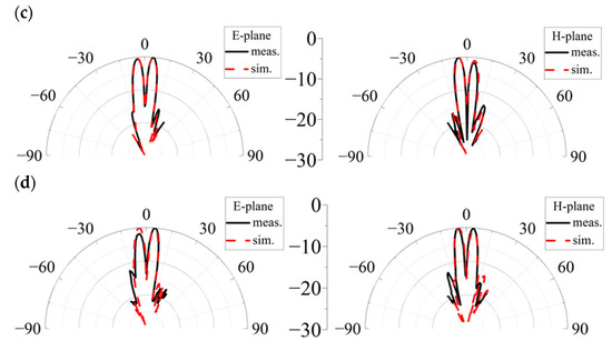 Simulated and measured normalized far-field patterns of the proposed OAM generator at (a) 28.5 GHz, (b) 30 GHz, (c) 35 GHz, (d) 40 GHz.