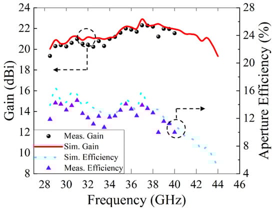 The gain spectrum and aperture efficiency of the generated vortex beam versus frequencies are plotted in Figure 9. The peak gain measured at 37 GHz is 22.3 dBi, and the aperture efficiency is 13.88%. The simulated gain variation is less than 3 dB over the range of 28.5–43.5 GHz (the relative bandwidth is 42.86%). However, the measured 3 dB gain range of the generated OAM beam is 28.5–40 GHz (the relative bandwidth is 32.85%), since the vector network analyzer has a maximum measurement frequency of 40 GHz. The above results reveal that the proposed OAM generator can simultaneously obtain wide OAM mode purity bandwidth and gain bandwidth.