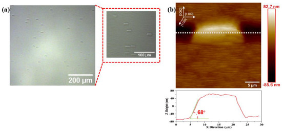 (a) Optical microscope image of the surface of an AlN sample annealed at 1700 °C; (b) AFM image of volcano-like protrusions on the surface of an AlN sample annealed at 1700 °C.