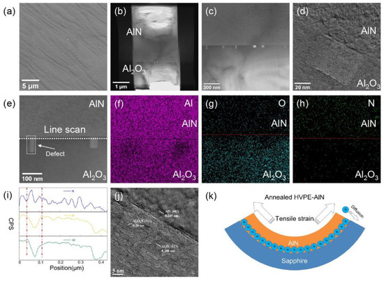 (a) SEM image of the surface of an AlN sample annealed at 1700 °C under a magnification of 8000 times; (b) STEM image of a cross section under a magnification of 35,000 times; (c) STEM image of defects at the AlN/sapphire interface; (d) HRTEM image of a single rectangular defect; (e) TEM-EDS surface scan at the defect; (f) EDS result of Al; (g) EDS result of O; (h) EDS result of N; (i) EDS line scan; (j) single defect schematic diagram of element calibration; (k) schematic diagram of N diffusion.