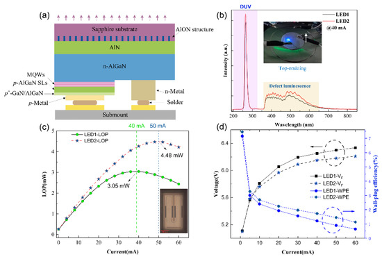 To study the gap between the performance of the DUV-LED based on the HVPE-AlN HTA template and traditional devices, we selected unannealed HVPE-AlN and AlN annealed at 1700 °C to fabricate LED1 and LED2, respectively. Compared with LED1, in addition to the improvement in epitaxial material, the LED2 structure contained many rectangular AlON structures in the sapphire substrate near the AlN side, as shown in Figure 6a; they cannot be ignored. In Figure 6b, we tested the electroluminescence (EL) spectra of the epitaxial wafers of the two groups of samples at 40 mA. In the spectra, the luminous intensity of the LED2 sample was slightly (approximately 10%) higher than that of LED1. Epitaxial AlGaN based on HTA-AlN will reduce the dislocation density in AlGaN [36]. The reduction in the dislocation density is very important for the realization of a high-LOP DUV-LED [37]. The lower dislocation density in the AlGaN layer enables a higher carrier transfer efficiency and, thus, higher LOP.