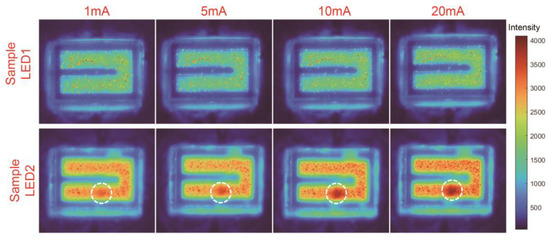 The two LED chips were tested for microscopic light distribution at 1 mA, 5 mA, 10 mA, and 20 mA.