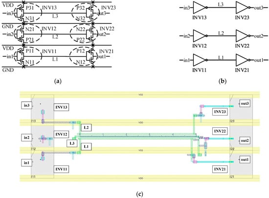 Figure 4c, INV11, INV12, INV13, INV21, INV22 and INV23 are library standard cells, which are displayed as gray areas located in the space between VSS and VDD.