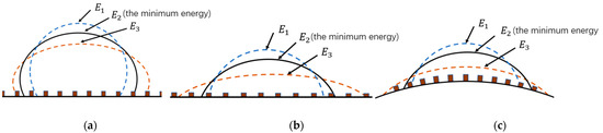 E2 is the minimum total energy in all possible total energies; thus, state 2 is the real state. (a) An axisymmetric heavy droplet on a microstructured superhydrophobic plane. (b) An axisymmetric heavy droplet on a microstructured superhydrophilic plane. (c) An axisymmetric heavy droplet on a microstructured superhydrophilic external spherical surface.