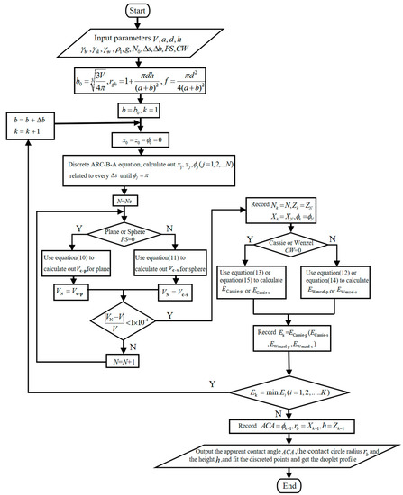According to the algorithm mentioned above, the flow chart for the calculation of the wettable parameters of the axisymmetric heavy droplet is shown in Figure 4.