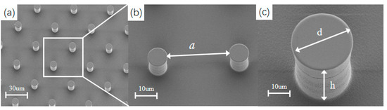 The fabrication process for the Si rough surface started from 4-inch n-type (100) silicon wafers (Figure 5). First, the AZ4620 photoresist (Qiyao, Shenzhen, China )was patterned for the diameter and the periodic spacing of the periodic circular microstructures. Second, deep reactive ion etching (DRIE) was processed for the height of the circular microstructures. Third, the photoresist was striped in wet solution, and we got Si microstructures on the surface. The deep reactive iron etching (DRIE) process used passivation and etching cycles, with a flow rate of 85 sccm for C4F8 in the passivation cycle and 85 sccm for SF6 in the passivation cycle.