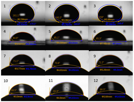 As shown in Figure 7, picture numbers 1–12 are respectively related to the 12 wettable types in Table 1. In all conditions, red lines coincided exactly with yellow lines. Blue lines coincided with yellow lines only when , whereas the blue lines largely deviated from the yellow lines when . This means our model adapts to all conditions, which means it is more accurate and universal than the ellipse model [11,12,23,24].