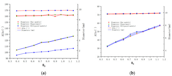 Figure 8 further shows the excellent universality and good accuracy of our model. No matter how smooth or rough, hydrophobic or hydrophilic, horizontally flat or spherical the surfaces were, our model data coincided highly with experimental data with different values of from 0.3 to 1.2. Conversely, the ellipse model was not accurate when , which limits its use on superhydrophobic surfaces.