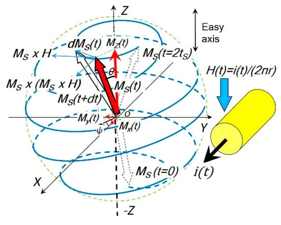 The rotational model used in the coil core structure. If the magnetic field H is applied in the Z direction, the saturation magnetization vector MS(t) follows a precession trajectory (blue) from its initial position (θ0 ≈ π, m0 ≈ −1) and the angle θ decreases with time continuously until (θ ≈ 0, m ≈ 1), i.e., the magnetization MS(t) reverses itself and is eventually aligned with the magnetic field H.