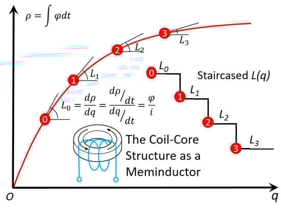 The constitutional ρ–q curve of the meminductor. It complies with the three criteria for the ideality of an ideal circuit element with memory [10,11]: a. nonlinear; b. continuously differentiable; and c. strictly monotonically increasing. With the accumulation of the charge, decreases like a staircase.