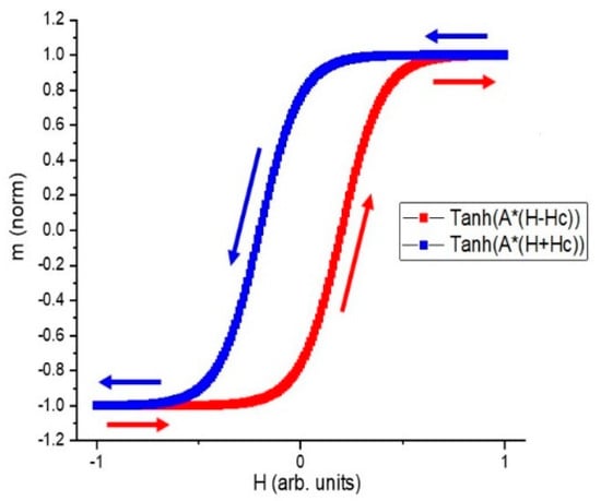 The simulated m–H loop based on ] (HC is the coercive force) with a sine-wave input current. Two tanh values are used, and a horizontal shift is applied to each branch to obtain hysteresis.