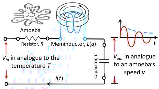 As shown in Figure 7, a simple RLC neuromorphic circuit using a coil core meminductor, L(q), is designed. The temperature controlling the motion of an amoeba is analogous to the input voltage, Vin, whereas the output voltage, Vout, is analogous to the locomotive speed of the amoeba.