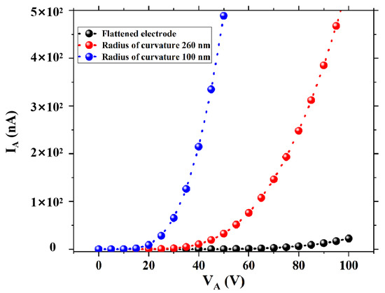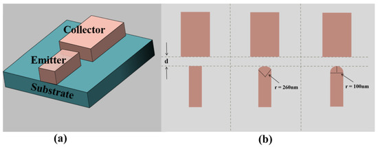 To illustrate the influence of emitter tip morphology on field emission performance, three different types of planar-type NVCTs were designed. Figure 2 shows the top view of planar-type NVCTs with the emitter of the flattened electrode, which has a radius of curvature of 260 nm and 100 nm, respectively. The vacuum channel length d is fixed, set as 100 nm. In addition, the emission current versus collector voltage is shown in Figure 3, from which the turn-on voltage decreases from ~80 V to ~20 V, and the emission current increases by an order of magnitude with the decreasing radius of curvature.