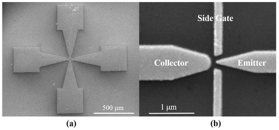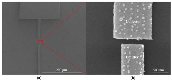 Further characterization of the devices was required after fabrication. As shown in Figure 4a, a planar-type NVCT with a flat emitter structure was successfully fabricated, with a vacuum channel of ~100 nm. Figure 4b shows the zoom-in of the nanoscale vacuum channel structure.