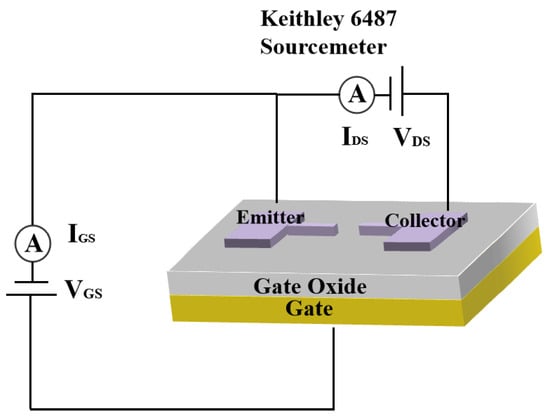 The schematic diagram of the test setup is shown in Figure 5, where the Keithley 6487 emitter meter connects the emitter to the collector, providing the emitter-collector voltage VG and recording the emission current. The output characteristic curve is obtained by recording the emission current while scanning VA, with a fixed gate voltage VG. Furthermore, we can obtain a cluster of output characteristic curves by varying the VG. Furthermore, it is necessary to measure under vacuum conditions to avoid ionization. In the test, the vacuum level in the vacuum chamber is set at around 10−4 Pa at room temperature.