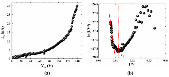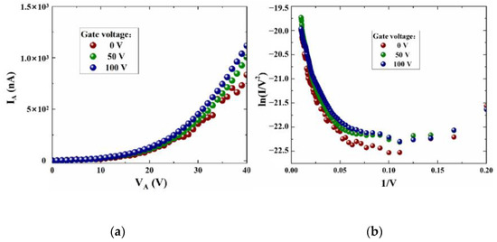 Figure 10. (a) IA versus VA at different gate voltages, (b) F-N fitting curve.