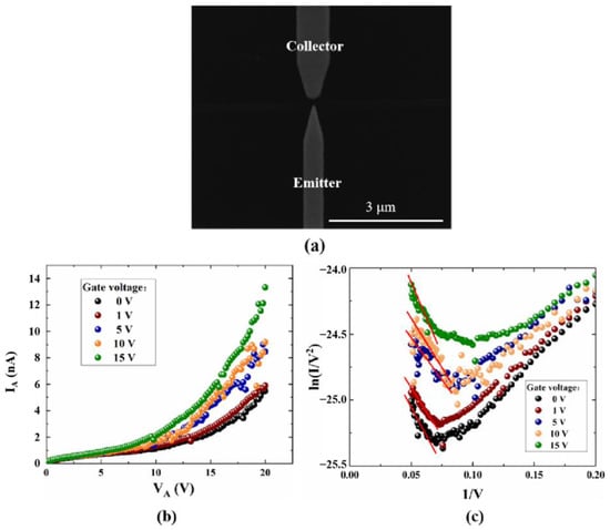 Figure 7. The electrical performance test curves, (a) SEM images of back-gate NVCT, (b) emission current versus collector voltage, and (c) F-N fitting curve.