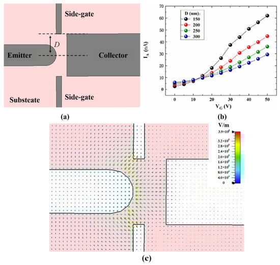 Based on the planar-type devices, we further designed a side-gate NVCT, as shown in Figure 8. Figure 8a shows a top view of the simulation model of the side-gate NVCT, with the dual gates located on both sides of the emitter and the collector. The vacuum channel length is set at 100 nm, with the side gate at a distance of D from the center line. The distance between the side-gate and the emitter becomes closer with the decreasing D, such that the modulation effect of the gate becomes more significant. Furthermore, numerical simulations were carried out for the side-gate structure. Figure 8b shows the variation in emission current versus gate voltage for different D values with a fixed collector voltage VA = 20 V. We find that the emission current continuously increases with decreasing D at the same gate voltage. This illustrates the strong modulation of the side-gate, which is consistent with the reported results. On the other hand, the increase in gate voltage not only enhances field emission, but also increases scattering. The emission current increases with increasing VG, while the electron utilization of the device is decreasing. Based on the simulation results, we selected 150 nm as the interval between the emitter and the collector.