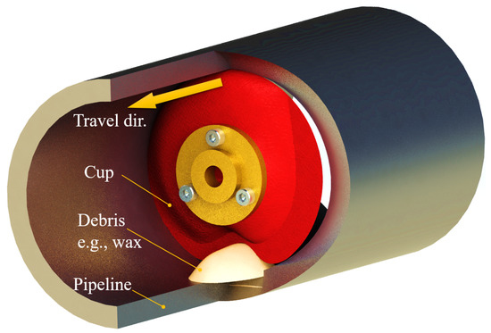 Pipeline inspection gauges (PIG) are a critical tool to ensure the operation continuity of oil and gas transportation. The primary function of a PIG is to clear debris and flow obstructing matter, and often it is equipped with sensors designed to inspect structural anomalies or early degradations without halting the entire pipeline transport [1]. The necessity for regular pipeline inspection is due to the suspending fluid state of the transported good inside the pipeline, where separated water, sand, or wax from the transported fossil fuels would condense, and form flow-blocking obstacles, neglecting which would be costly in terms of reduced transportation efficiency or even system failure [2]. In Figure 1, the cross-sectional view of a typical PIG working inside a pipeline is demonstrated. As the key functional component, the rubber cup assumes two main functions during operation: isolating the fluid before and after the PIG to form a contamination control barrier, and creating a pressure differential, which would then become the driving force for the PIG to traverse inside the pipeline, and the force to clean and scrub the debris off the inner wall [3]. So far, most state-of-the-art PIGs with pipeline inspection functions have diameters greater than 300 mm, and the main limiting factor is the bulky size of the inline inspection (ILI) devices. For production pipelines with medium to small inner diameters (ID), there is no practical way of in-situ wall inspection.